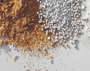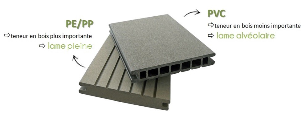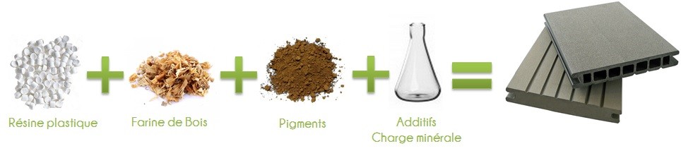 Les lames de bois composite sont réalisées à partir de poudre de bois (60/80 mesh ou environ 0.25 mm) ou de toute autre matière végétale (par exemple les balles de riz, les anas de lin, etc..) qui nécessite une installation assez conséquente. Ensuite, après introduction de billes en plastique (PE ou PP) et après extrusion, on obtient les lames de bois composite.