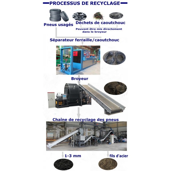 Recycler les pneus usés pour réutiliser les fils d'acier et le caoutchouc qui entrent dans leur composition, c'est un enjeu des temps modernes plutôt que de se faire envahir par des montagnes de pneus ou de les brûler avec les conséquences écologiques que l'on connaît.